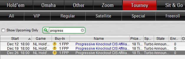 The freerolls are called Progressive Knockout CIS Affiliate Special. They’re already available in the poker room lobby on Tourney - Private tab.